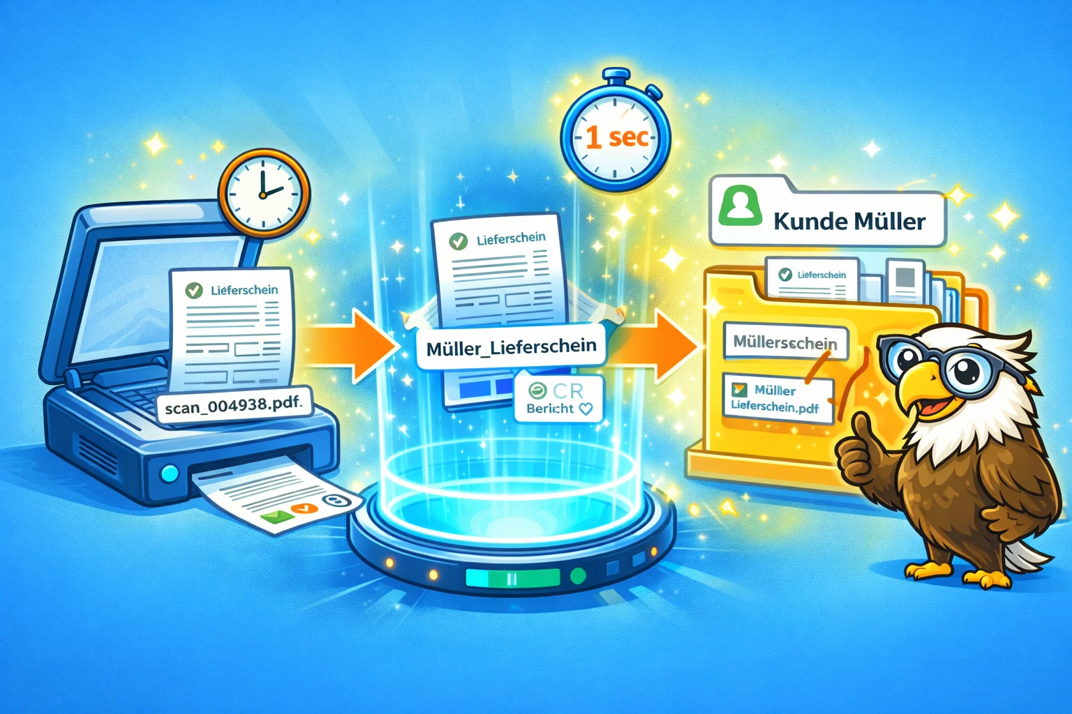 Lieferscheine werden gescannt und müssen anschließend nach Kundenname sortiert und abgelegt werden. Die manuelle Umbenennung und Zuordnung war zeitaufwendig. Meine Automatisierung erkennt den Dokumenteninhalt per OCR, benennt die Datei automatisch um und sortiert sie in den richtigen Ordner ein.