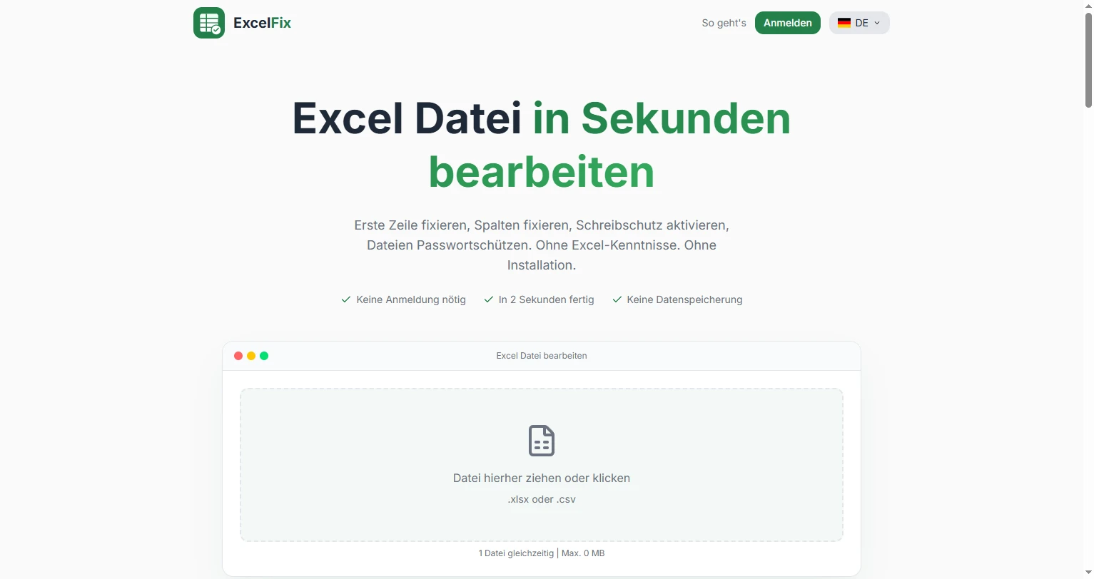 Ein Online-Tool, mit dem Excel-Dateien in Sekunden bearbeitet werden können - ohne Excel-Kenntnisse und ohne Installation. Funktionen wie Zeilen fixieren, Schreibschutz, Passwortschutz und CSV-Export machen den Umgang mit Excel-Dateien für jeden zugänglich.