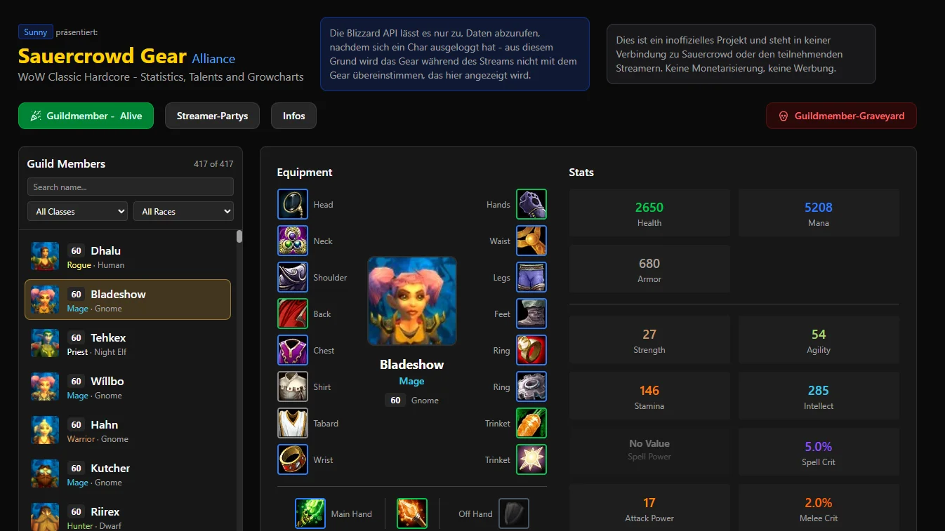 Für ein deutschlandweites Streaming-Event in World of Warcraft habe ich eine Plattform entwickelt, die den Stand aller Spielcharaktere in Echtzeit anzeigt - Level, Statistiken, Talente und Ausrüstung.